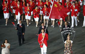 當身著紅黃國旗色正裝的中國健兒大步入場時,一曲“最炫中國風”也正式在“倫敦碗”里奏響。其中,為中國軍團掌旗開道的男籃帥哥易建聯(lián)無疑是最閃亮的明星。高擎國旗、接受全場歡呼時,平時霸氣十足的阿聯(lián)也不禁露出了害羞的微笑。