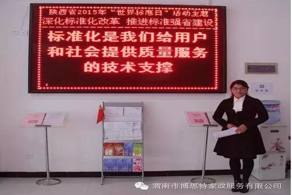 | 渭南市博思特家政服務(wù)有限公司 讓標準成為習(xí)慣 讓習(xí)慣符合標準 渭南市博思特家政服務(wù)有限公司制定標準206項,其中國家標準53項,行業(yè)標準5項,地方標準4項,企業(yè)標準144項,辦公室引用101項,家政部引用49項,工程部引用34項,人力資源部引用7項,財務(wù)部引用5項。 2014年8月發(fā)布陜西省地方標準《家政服務(wù)指南 母嬰護理》、《家政服務(wù)指南 居家養(yǎng)老護理》 ; 2014 年9月發(fā)布渭南市標準《家政服務(wù) 搬家服務(wù)質(zhì)量規(guī)范》、《家政服務(wù) 育嬰服務(wù)質(zhì)量規(guī)范》、《養(yǎng)老機構(gòu)服務(wù)質(zhì)量范》; 2015年9月發(fā)布渭南市家政服務(wù)團體(聯(lián)盟 )標準《家政服務(wù)企業(yè)等級劃分與評定》、《家政服務(wù)員培訓(xùn)質(zhì)量規(guī)范》、《家庭衛(wèi)生間清潔服務(wù)質(zhì)量規(guī)范》; 2015年送審稿已報批,為陜西省地方標準《養(yǎng)老機構(gòu)護理服務(wù)質(zhì)量規(guī)范》、《家政服務(wù)指南—家庭廚房保潔》。 博思特家政服務(wù)有限公司 標準化工作機構(gòu)設(shè)置 公司設(shè)立以總經(jīng)理為首的標準化委員會,負責(zé)領(lǐng)導(dǎo)全公司的標準化工作,公司標準化組織由四個層次組成,即公司標準化管理委員會,公司標準化工作管理小組(設(shè)在辦公室),各職能部門標準化主管領(lǐng)導(dǎo)及部門標準化兼職管理員組成的公司標準體系工作組。 1.標準化工作機構(gòu)的最高領(lǐng)導(dǎo)者是公司總經(jīng)理; 2.標準化委員會由總經(jīng)理、質(zhì)量體系的管理者代表(常務(wù)副總經(jīng)理)。公司主要職責(zé)能部門負責(zé)人及標準化有關(guān)專家組成,由總經(jīng)理擔(dān)任標準化委員會主任,標準化委員會設(shè)秘書組,由公司辦公室主任擔(dān)任秘書長; 3.公司辦公室是標準委員會日常工作和對公司及公司各部門標準化工作統(tǒng)一歸口管理; 4.標準體系工作組由公司各部室標準化主管領(lǐng)導(dǎo)和兼職標準化管理員組成,業(yè)務(wù)上受公司辦公室指導(dǎo),承擔(dān)所在部門的標準化管理職責(zé)。 陜西地方標準宣貫----家政服務(wù)指南 母嬰護理 宣貫單位:渭南市博思特家政服務(wù) 今日宣貫內(nèi)容: